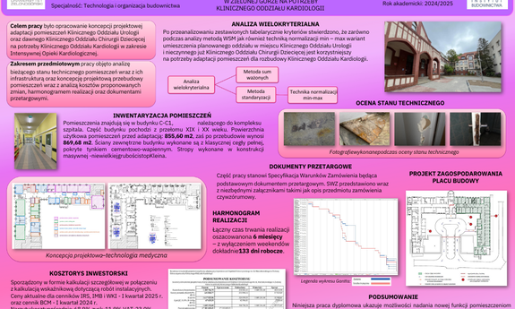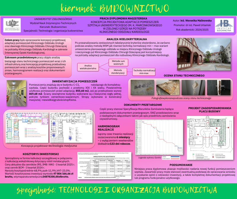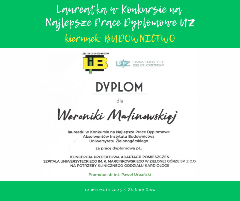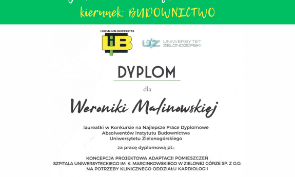 1. mgr inż. Weronika Malinowska – za pracę magisterską (specjalność: Technologia i Organizacja Budownictwa) pt.: Koncepcja projektowa adaptacji pomieszczeń Szpitala Uniwersyteckiego im. K. Marcinkowskiego w Zielonej Górze Sp. z o.o. na potrzeby Klinicznego Oddziału Kardiologii. Promotorem pracy był: dr inż. Paweł Urbański.
