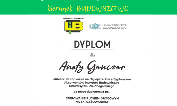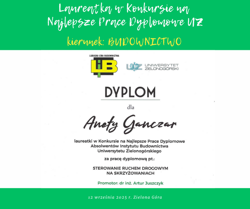 2. mgr inż. Aneta Ganczar za pracę magisterską (specjalność: Drogi i Mosty) pt.: Sterowanie ruchem drogowym na skrzyżowaniach. Promotorem pracy był: dr inż. Artur Juszczyk.