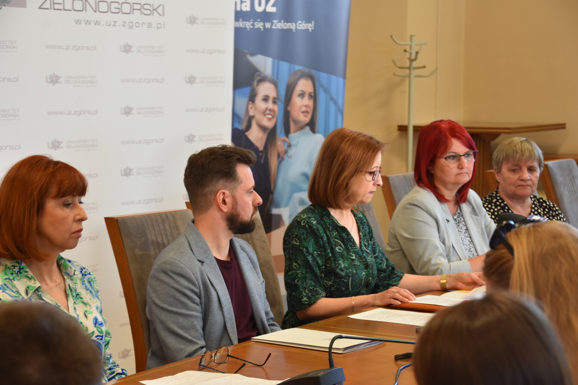 Konferencja prasowa - Rekrutacja 2023/24: mgr Ewa Sapeńko, dr Ewa Skorupka, dr Arkadiusz Tyda, dr hab. Barbara Literska, prof. UZ, dr hab. inż. Sylwia Myszograj, prof. UZ, fot. Biuro Promocji UZ
