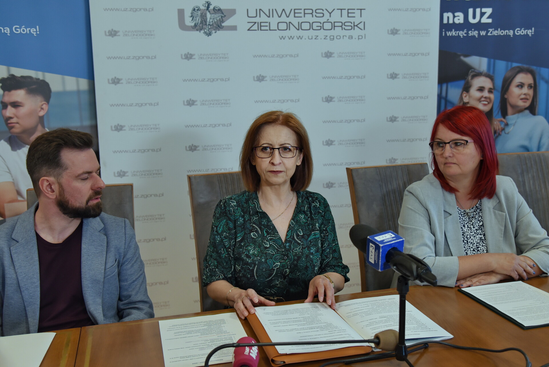 Konferencja prasowa - Rekrutacja 2023/24: dr Arkadiusz Tyda, dr hab. Barbara Literska, prof. UZ, dr hab. inż. Sylwia Myszograj, prof. UZ, fot. K. Adamczewski