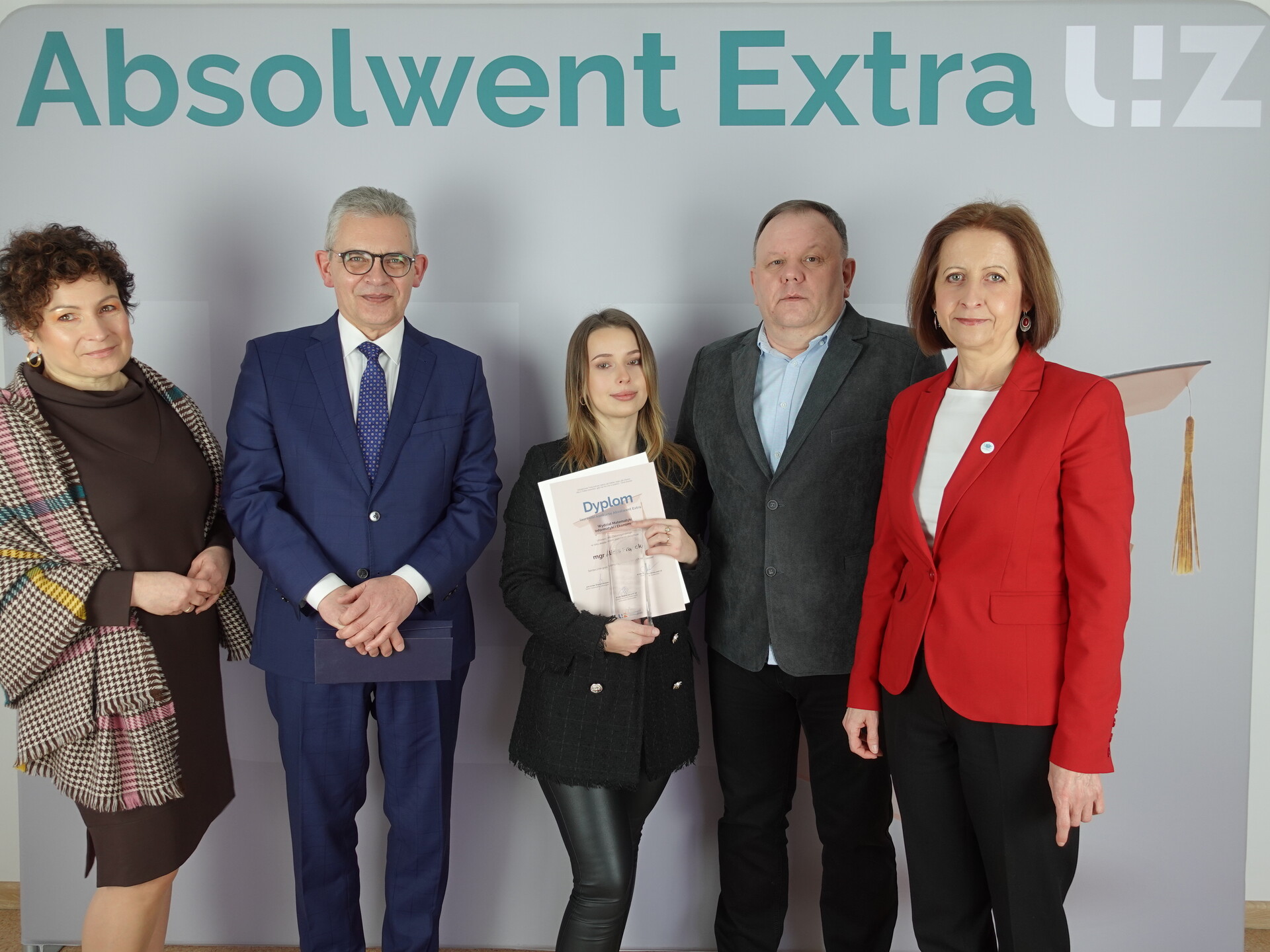 od lewej: mgr inż. Monika Politańska - Kierownik Biura Karier UZ, prof. dr hab. Wojciech Strzyżewski - Rektor UZ, mgr Alicja Frącek - Absolwentka Extra, dr hab. Bogdan Szal, prof. UZ - Dziekan WMIiE, dr hab. Barbara Literska, prof. UZ - Prorektor ds. Studenckich UZ; fot. M. Leśniak