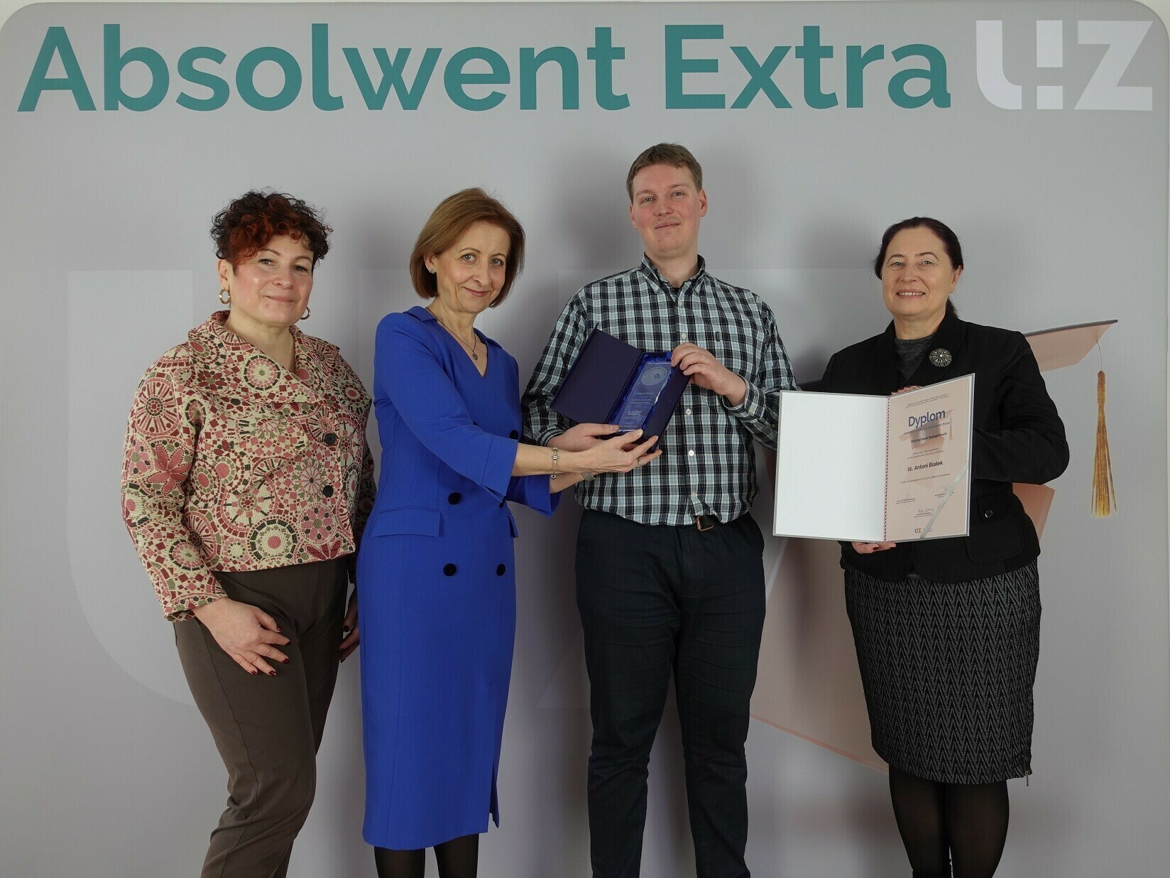 Od lewej: mgr inż. Monika Politańska - kierownik Biura Karier UZ, dr hab. Barbara Literska, prof. UZ – Prorektor ds. Studenckich, lic. Antoni Białek – Absolwent Extra oraz prof. dr hab. Beata Gabryś - dziekan Wydziału Nauk Biologicznych; fot. M. Leśniak